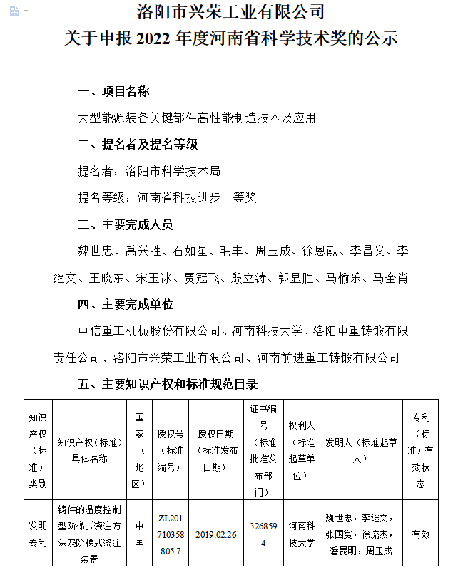 ????根據河南省科技廳《關于2022年度河南省科學技術獎提名工作的通知》要求,對馬愉樂參與“大型能源裝備關鍵部件高性能制造技術及應用”項目相關內容進行公示,公示時間:2022年 4 月 23 日起7個自然日。